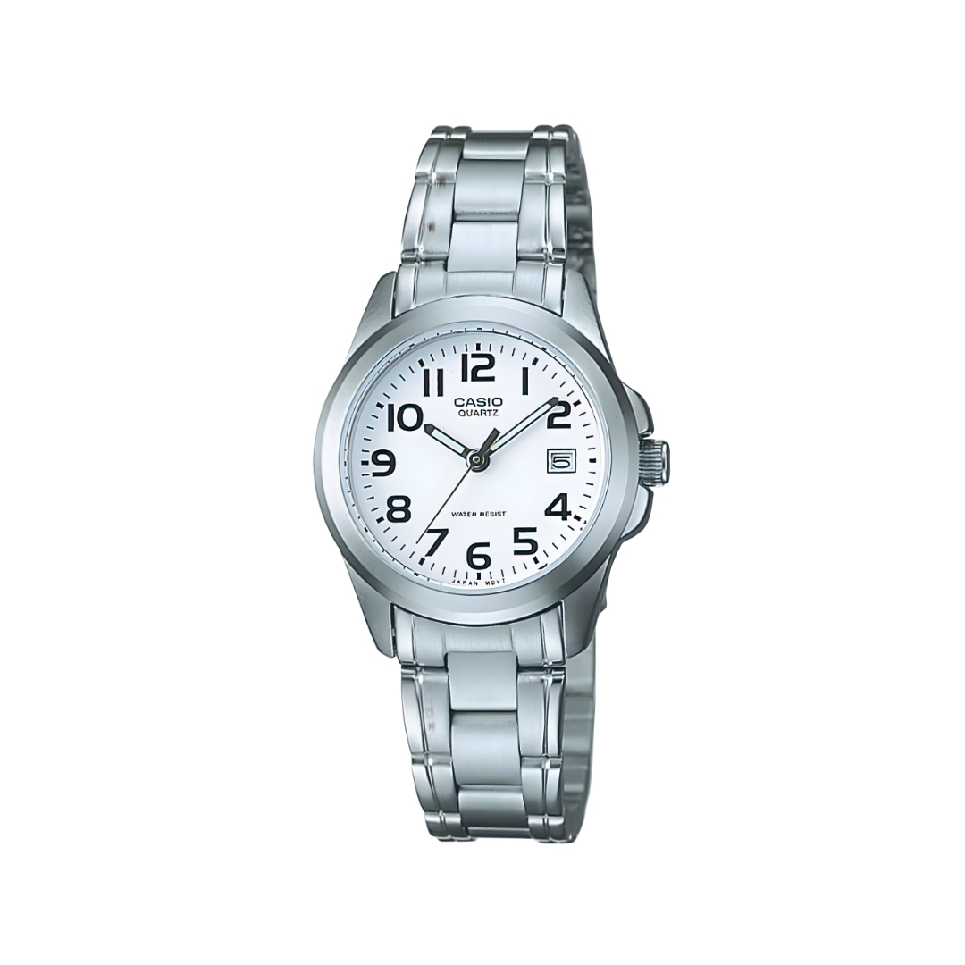 Relógio Casio feminino prateado com mostrador branco e design clássico. Um acessório elegante e resistente, ideal para o uso diário.