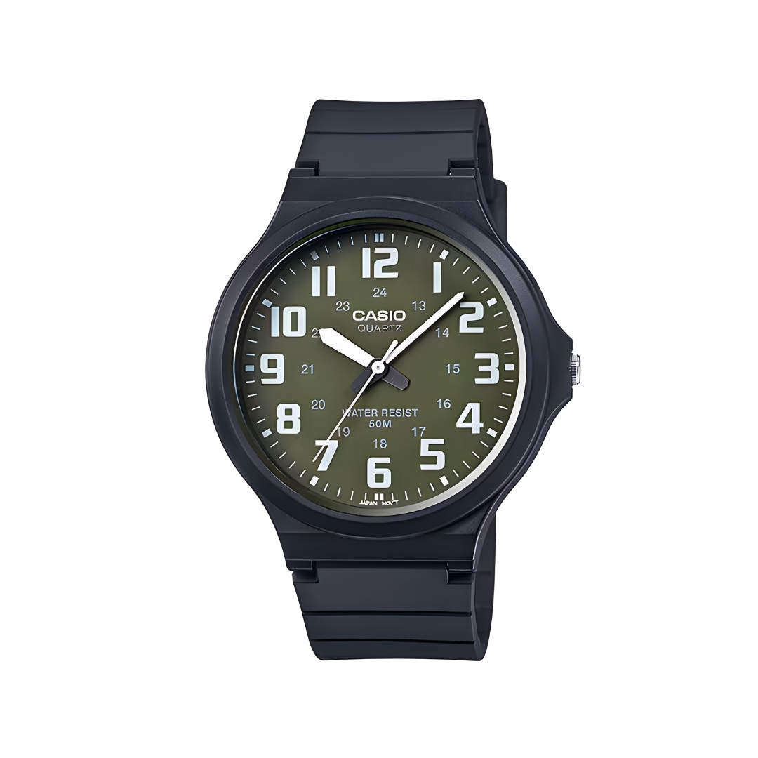 Relógio Casio masculino com pulseira de resina e mostrador verde. Simples, leve e resistente, ideal para o uso diário com estilo casual e conforto.