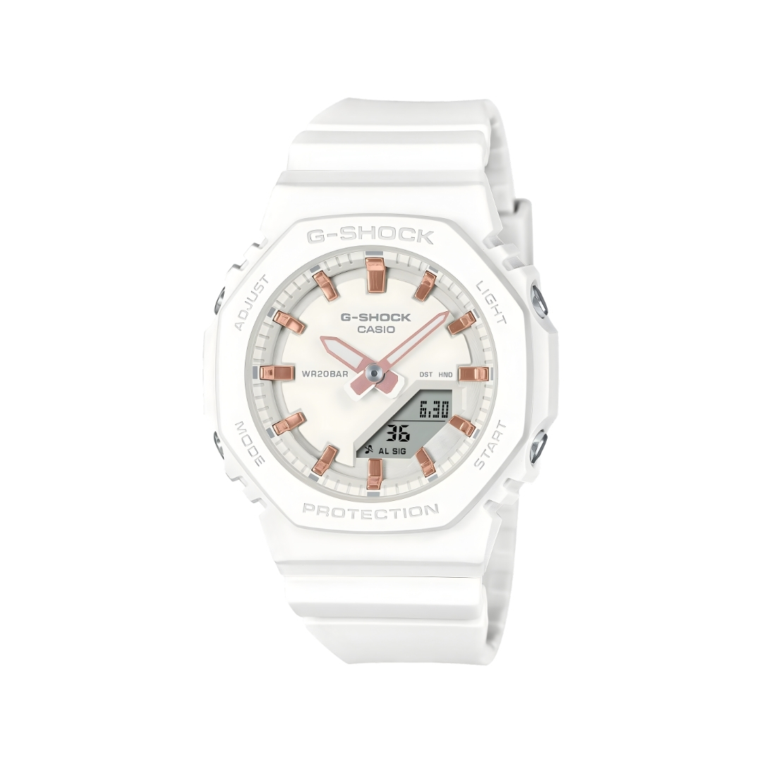 Relógio G-Shock feminino branco com mostrador anadigi e design moderno. Alta resistência, múltiplas funções e construção robusta para o dia a dia.