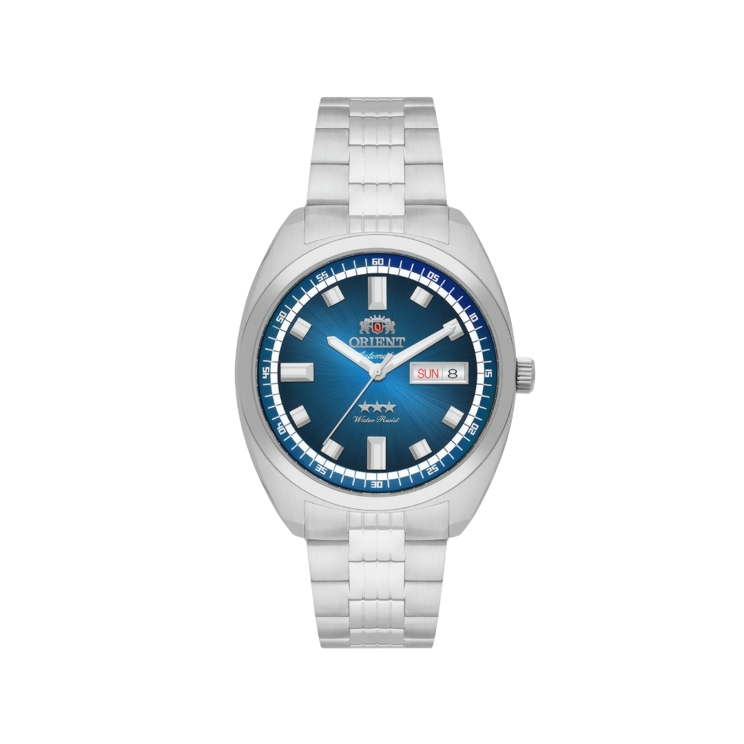 Relógio Orient Heritage masculino automático com mostrador azul, caixa em aço e vidro de cristal safira. Elegância clássica com calendário duplo e resistência à água de 100m.