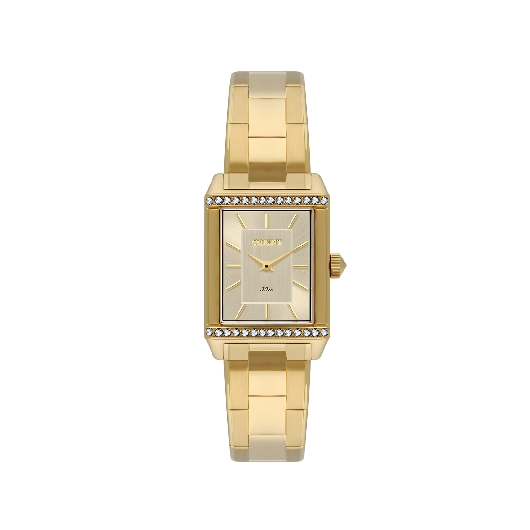 Relógio Orient Eternal feminino dourado, elegante e sofisticado, com caixa retangular fina e pulseira em aço inoxidável. Um modelo clássico ideal para uso diário e ocasiões especiais.