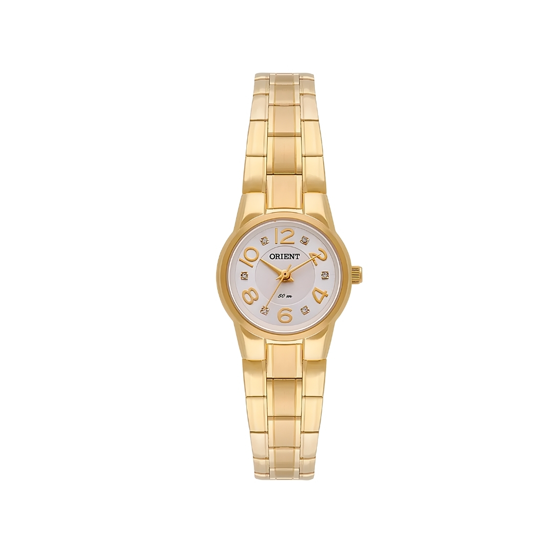Orient Eternal FGSS0067S2KX: relógio feminino dourado com caixa de 25 mm, pulseira em aço inoxidável e visual clássico. Elegante, preciso e resistente à água (5 ATM).