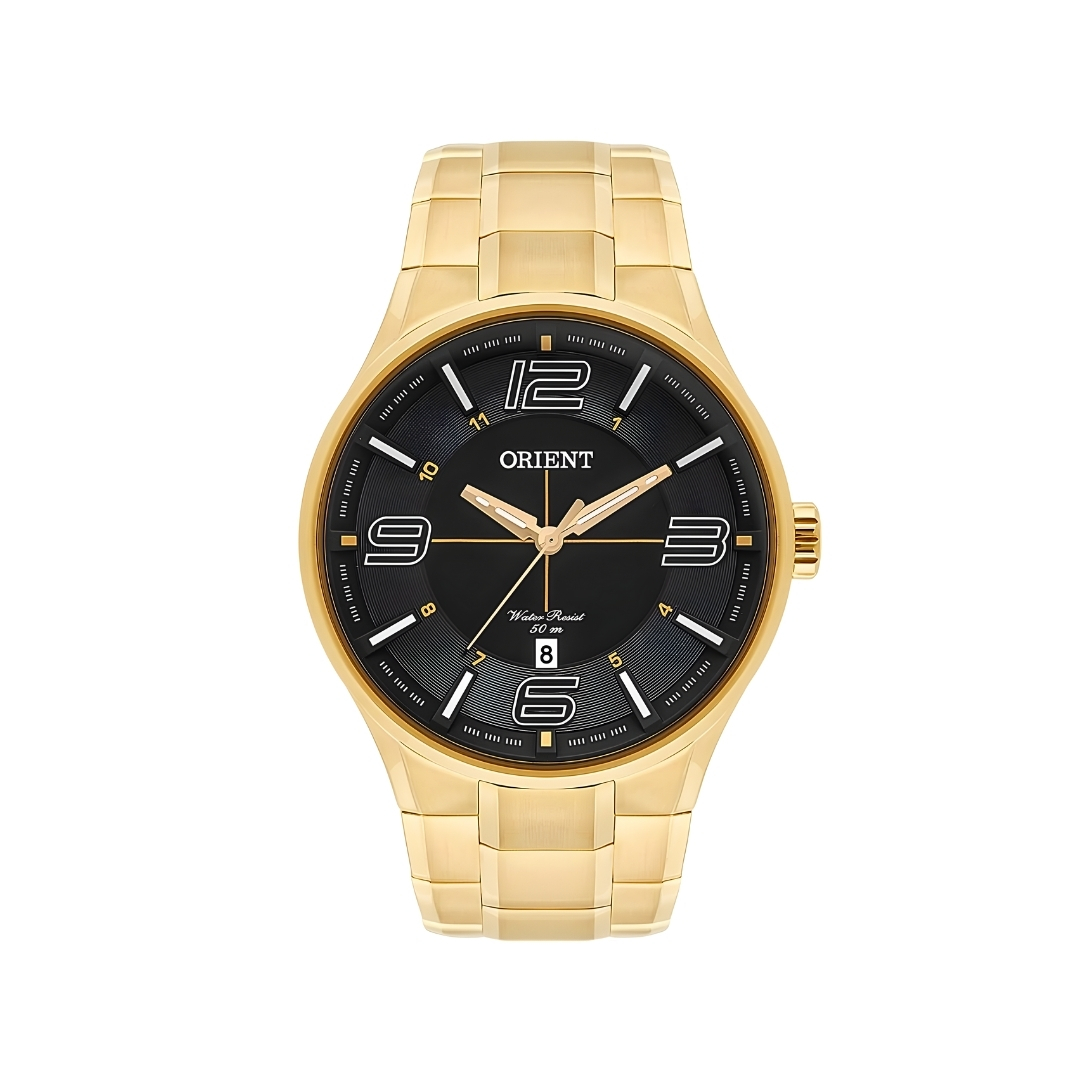 Relógio Orient Neo Sports masculino dourado com caixa de 45mm, mostrador preto e pulseira em aço inoxidável, combinando design esportivo e elegância para uso diário.