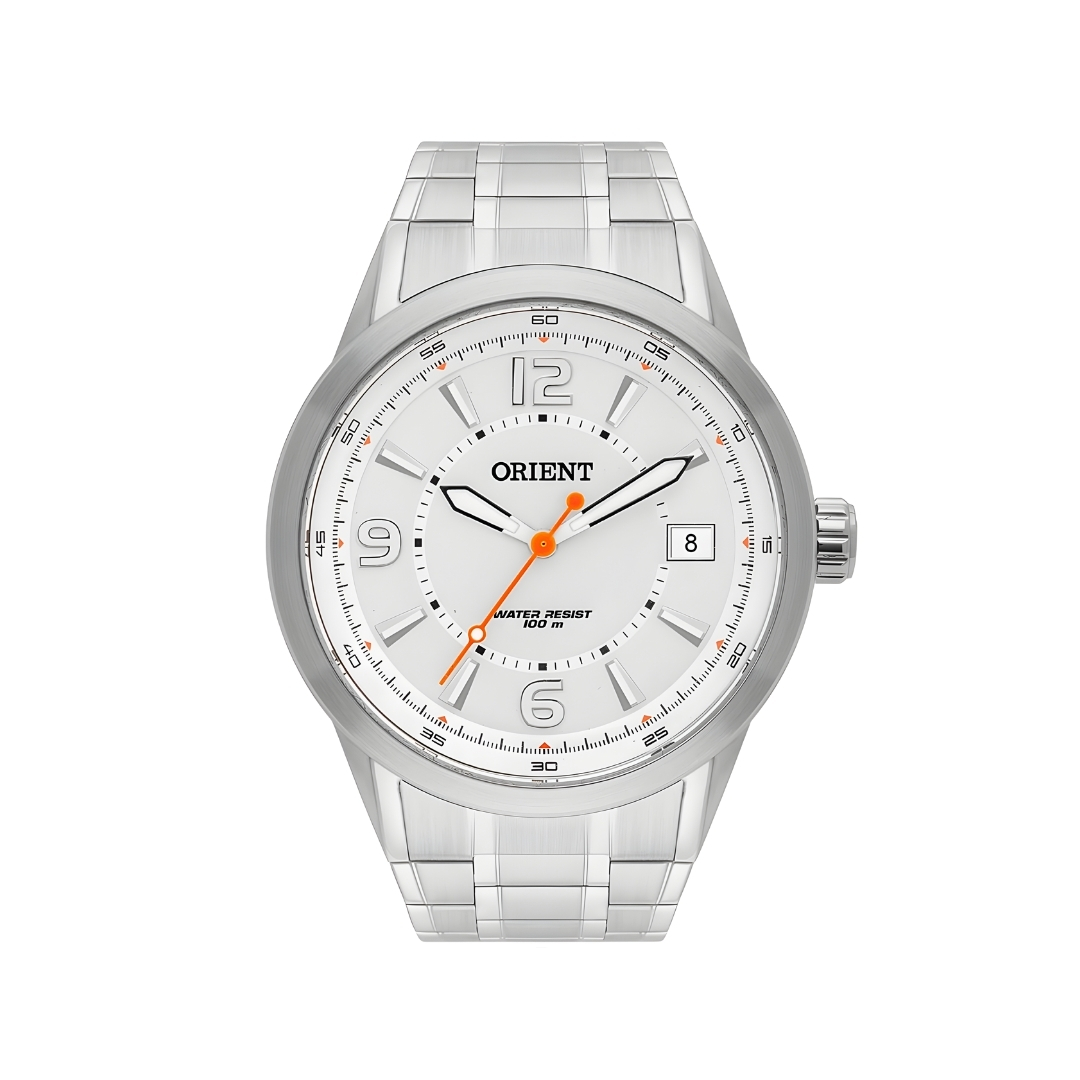 O Orient MBSS1269S2SX é um relógio masculino clássico, robusto e refinado, combinando caixa grande, mostrador branco e pulseira de aço para um visual elegante e versátil no dia a dia.
