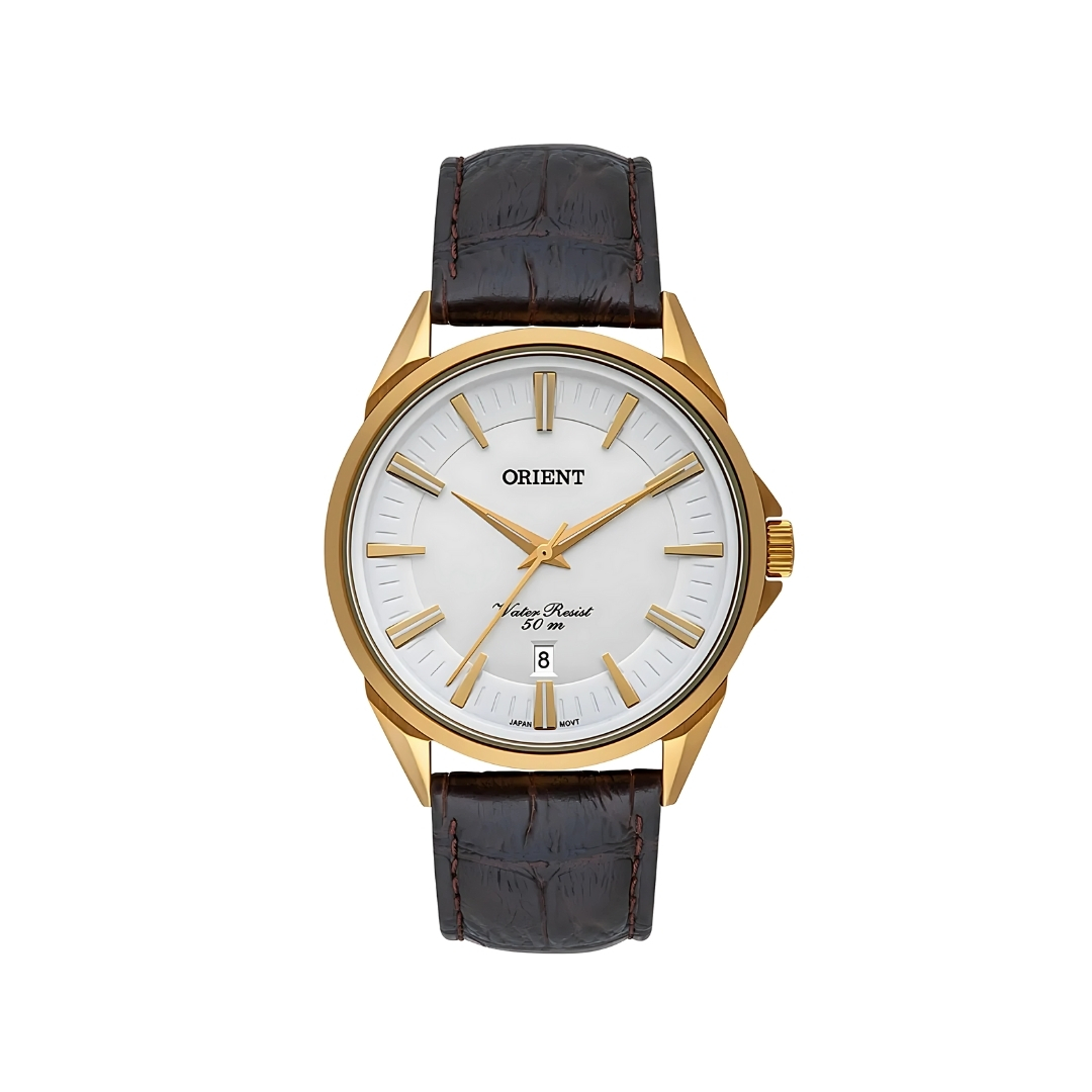O Orient MGSC1010S1PX combina caixa dourada em aço com pulseira de couro e mostrador branco, trazendo sofisticação e funcionalidade com calendário e ponteiros luminosos.
