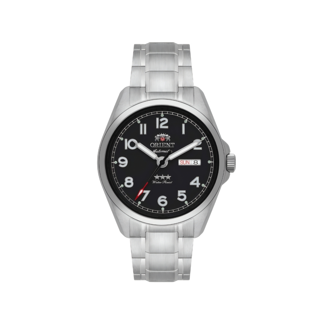 Relógio Orient 3 Estrelas masculino automático, mostrador preto com calendário duplo, caixa e pulseira em aço, vidro de safira e resistência à água de 100m.
