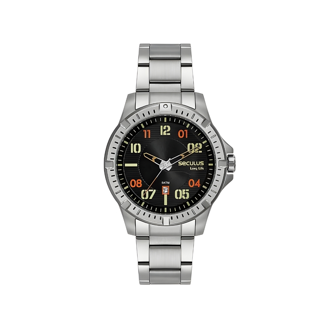 Relógio Seculus Long Life masculino com caixa prateada, mostrador preto com detalhes laranja e calendário. Ideal para quem busca estilo e funcionalidade com resistência à água de até 50 metros.
