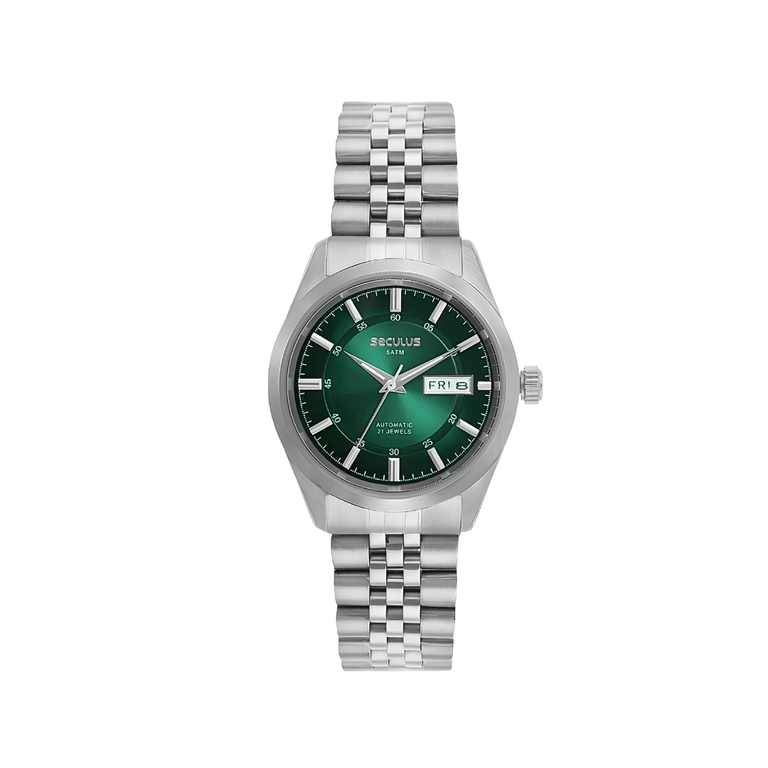 Relógio Seculus 77361G0SVNA3 automático prateado com mostrador verde, pulseira de aço e calendário completo. Modelo sofisticado, preciso e com autonomia de até 42 horas.