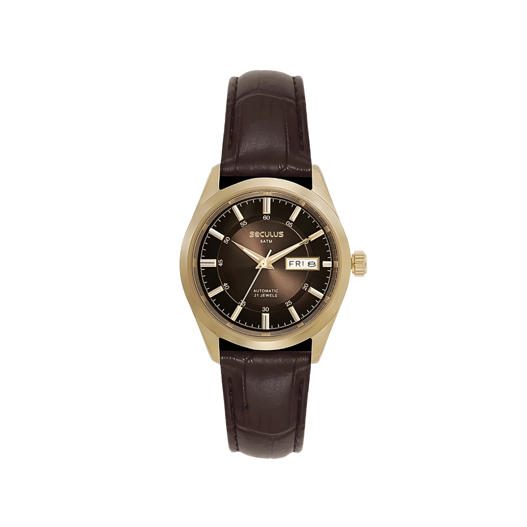 Relógio Seculus 77361GPSVDC9 masculino, com visual clássico dourado, mostrador marrom e pulseira de couro. Combina elegância, durabilidade e funções essenciais para o dia a dia.