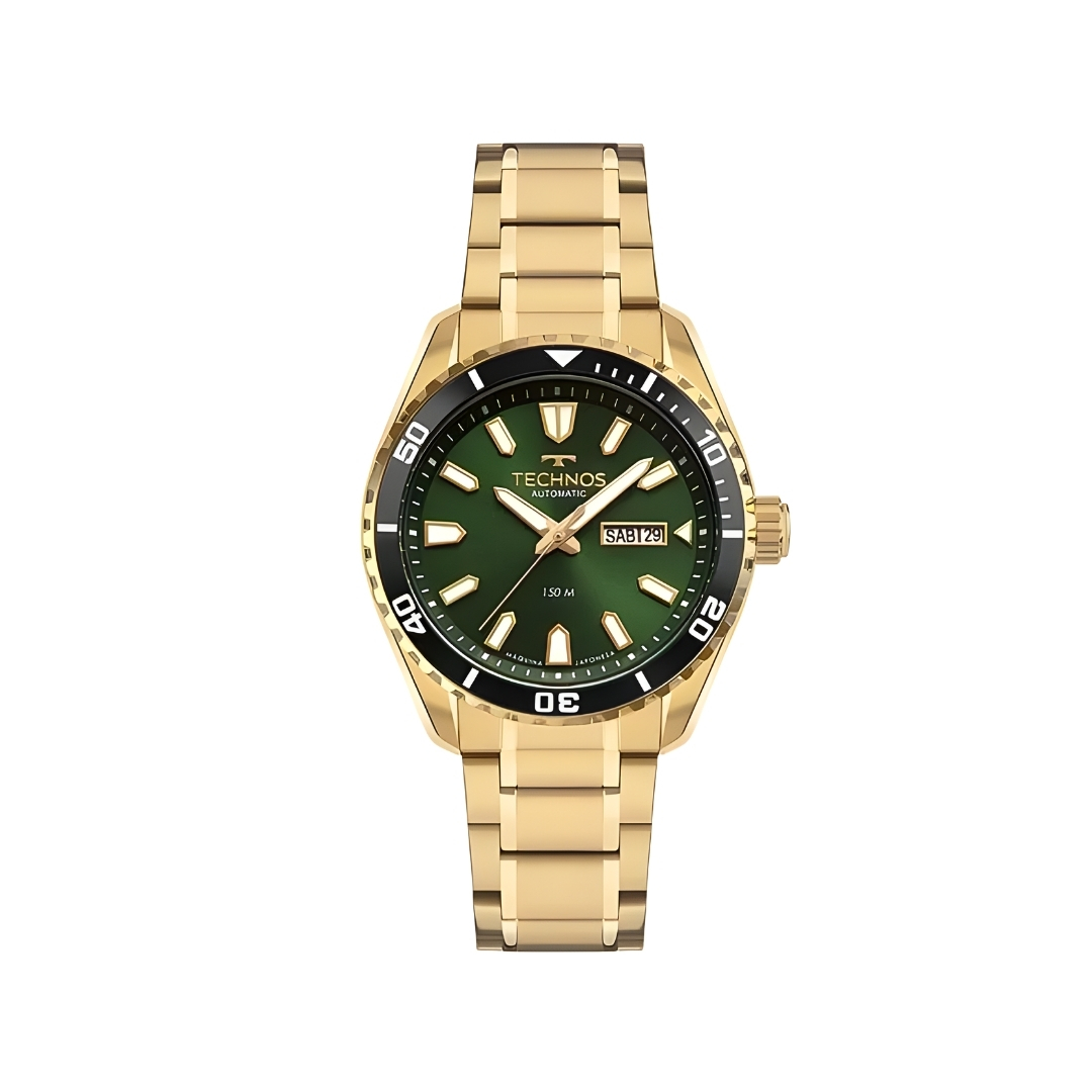Relógio Technos Automático 8205PG/1V em aço dourado com mostrador verde, bezel giratório, calendário completo e construção robusta de 15 ATM. Estilo marcante com movimento automático confiável.